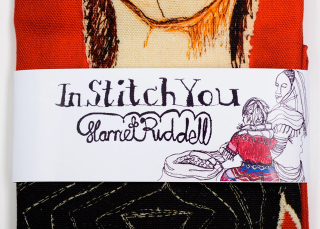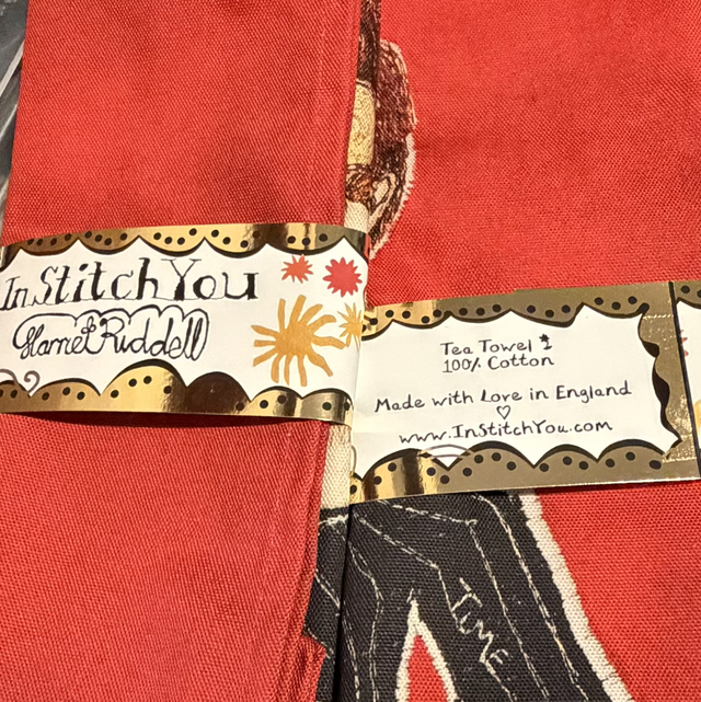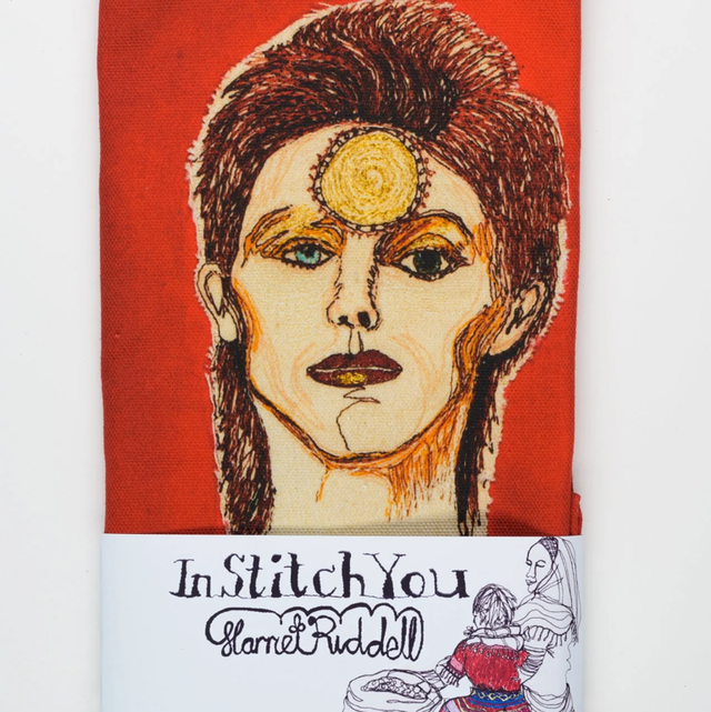 A David Bowie portrait created with machine embroidery printed on a tea towel. Beautiful vibrant colours and an excellent print for the wall or your dishes!